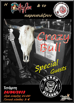 Ακολούθησε ολιγόλεπτο διαλλειματάκι και την εμφάνιση τους έκαναν οι CRAZY BULL. Κάποιοι θα τους χαρακτήριζαν rockμπάντα, κάποιοι άλλοι blues, ίσως είναι ένας συνδυασμός και των δύο! Σίγουρα πάντως είναι οι CRAZY BULL! Σταθεροί στις αξίες τους, για άλλη μια φορά καθήλωσαν το κοινό. Ξεκίνησαν με το δικό τους ”HANDFUL OF LOVE”, και ακούσαμε συνολικά έξι δικά τους κομμάτια (”ONE MORE TRY”, ”NIGHT ON FIRE”, ”BOOGIE TONIGHT”, ”DARKEST ROAD” KAI ”VELVET SKIN”). Φυσικά το set–list περιελάμβανε και πολλές και πετυχημένες διασκευές, με χαρακτηριστικά τα πολυαγαπημένα ”GIMME THREE STEPS” και ”SWAMP MUSIC” από LYNYRD SKYNYRD, ”SHARP DRESSED MAN” από ZZ TOP και το ”FOR THE LAST TIME” του αείμνηστου RORY GALLAGHER. Επίσης αίσθηση έκανε η τέλεια απόδοση στο ”UNSEEN EYE” από JOHNNY WINTER και προχωρώντας προς το τέλος το διαχρονικό ”BAD TO THE BONE” (GEORGE THOROGOOD). Με άψογα φωνητικά, φοβερό στυλ και το ”BACK IN THE NIGHT” (DR. FEELGOOD) οι CRAZY BULL μας ταξίδεψαν σε άλλους τόπους και χρόνους. Θα μπορούσαμε να τους ακούμε μέχρι το πρωί!